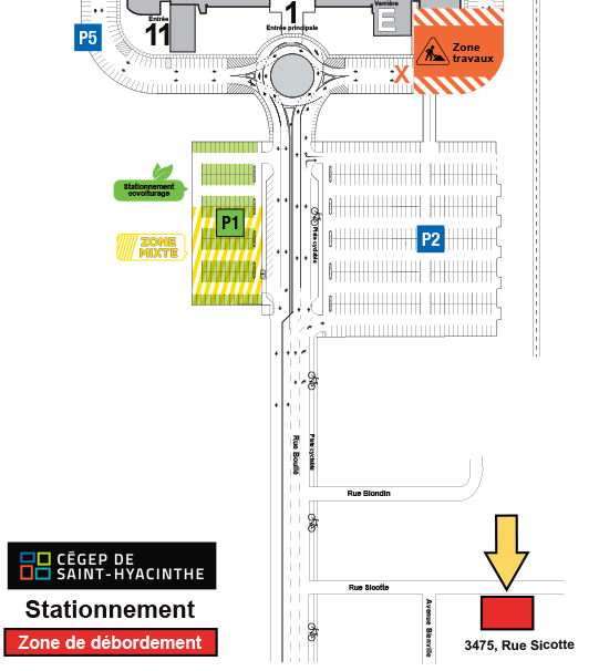 Il est recommandé d’arriver par la rue Guy-Daudelin, à l’arrière du Cégep, afin d’utiliser les stationnements arrière, plus nombreux, et ainsi éviter les bouchons entre l’avant et l’arrière du Cégep, à moins de posséder une vignette de covoiturage ou de conduire un véhicule électrique (accès au stationnement Écoresponsable – P1).